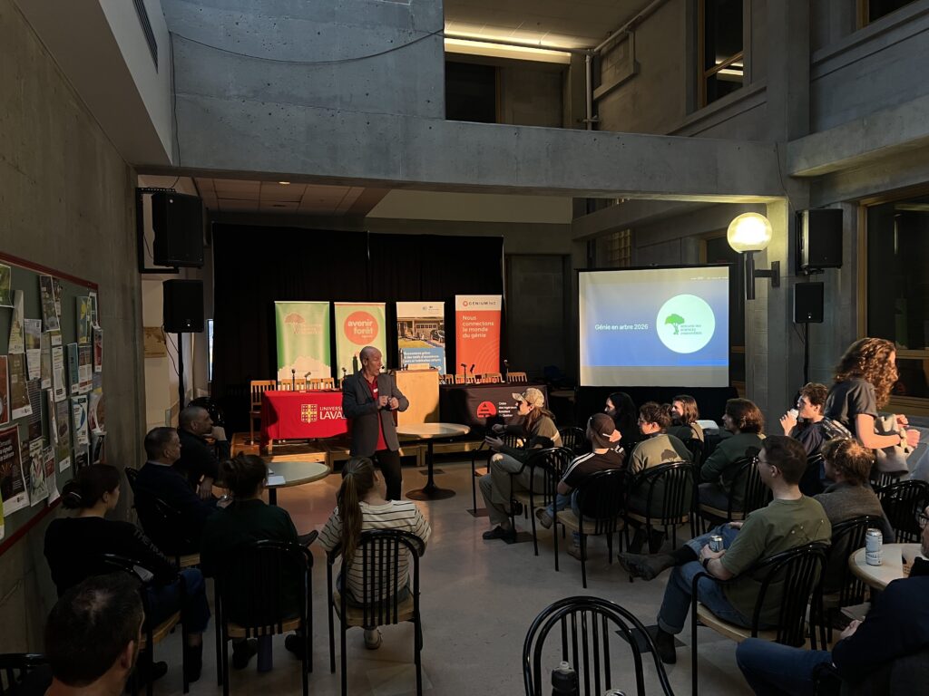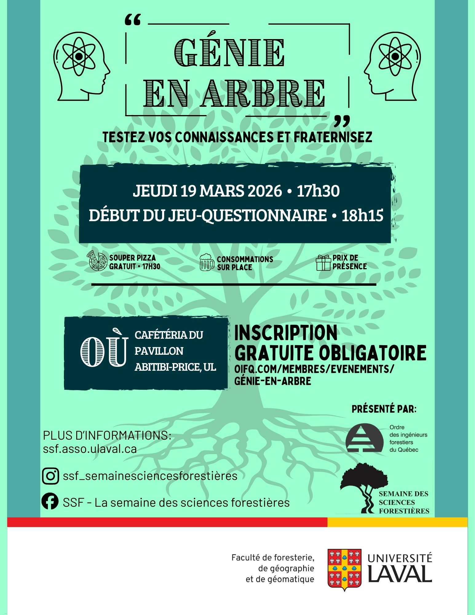 Dans le cadre de la Semaine des sciences forestières de la FFGG, l’Association des étudiants en foresterie et environnement de l’Université Laval et l’Ordre des ingénieurs forestiers du Québec vous invitent à l’activité Génie en arbre, le jeudi 19 mars 2026, à la cafétéria du Pavillon Abitibi-Price de l’Université Laval, dès 17h30.